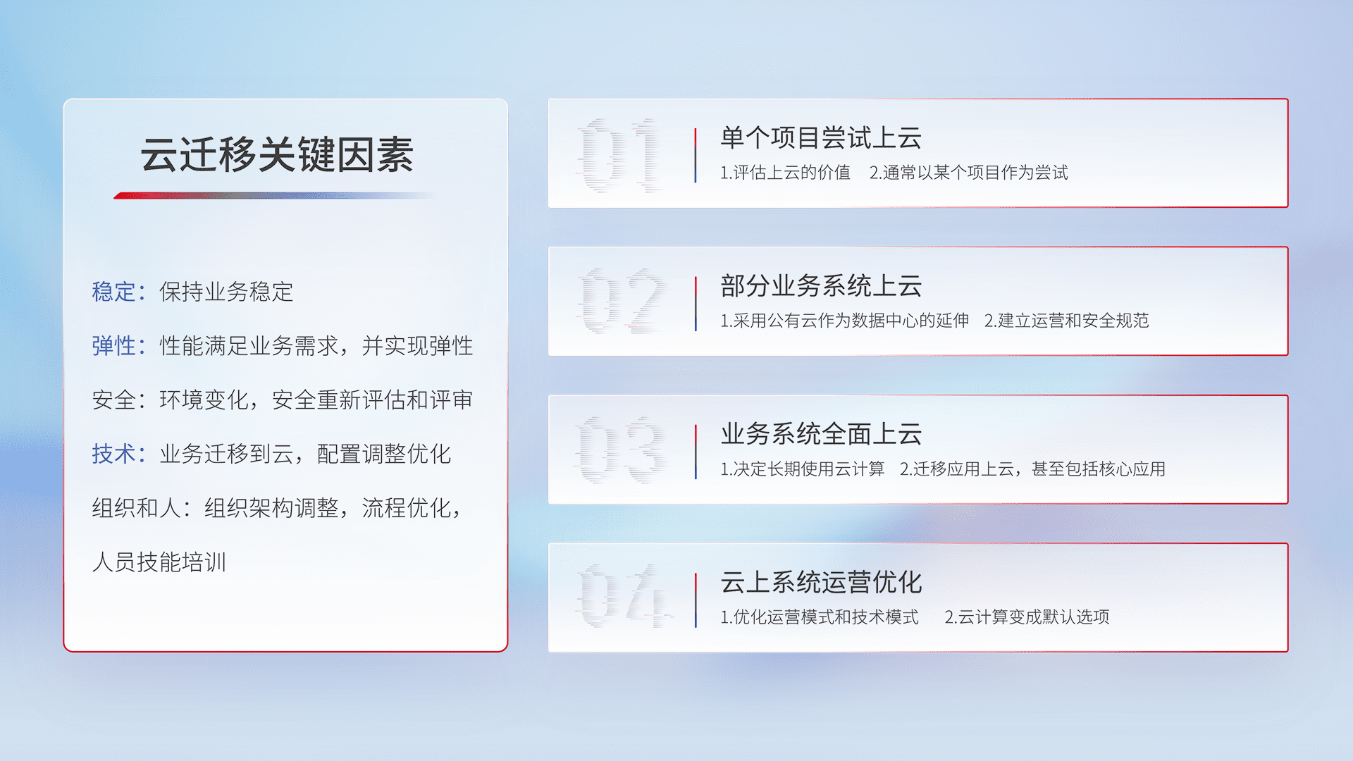 结合实际业务,,从规划设计、、、云平台选型、、、、云原生改造、、数据迁移、、集成交付,,,迁移全过程为客户识别最佳上云路径,,,,做好风险识别管理,,,,设计网络架构、、、、身份权限、、、安全审计合规、、、、操作审计、、、日志审计、、、、监控告警策略、、、、多站点容灾设计等,,,对云上基础设施进行整体规划,,提升IT治理水平,,,,以满足弹性、、高可用、、、高性能的需求。。