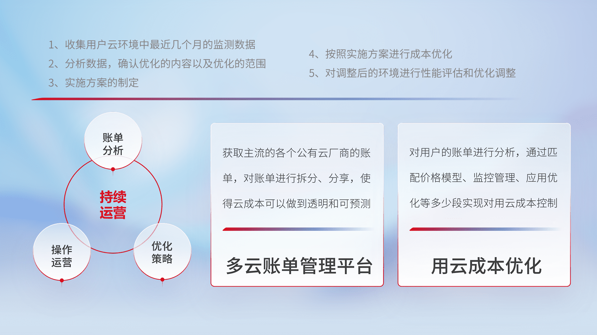 通过多云纳管,,,以统一的资源数据模型把客户的云资源进行抽象和封装,,,,进而实现对多云资源的统一操作,,,,保障云资源管理的可靠性、、、、稳定性与可用性。。量身定制化运维内容,,配置、、开发运维、、补丁管理、、、、备份、、监控、、认证和访问管理、、、审计和日常巡检等,,保障在用云过程中的可靠度,,,稳定度以及高可用率。。